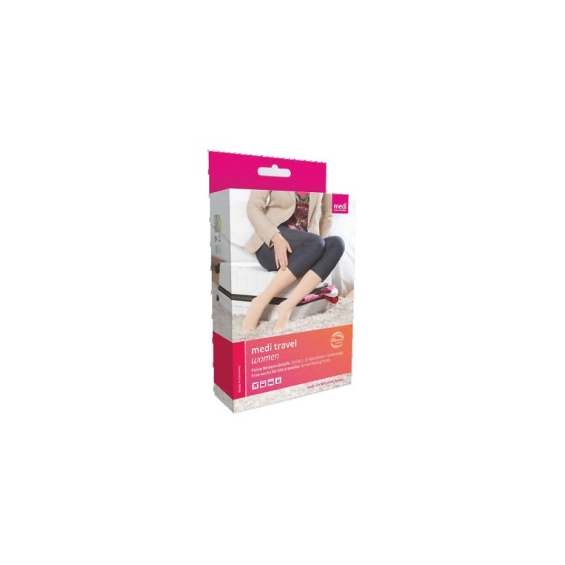 Η medi travel women είναι μια σπορ κάλτσα ταξιδιού. Σε μεγαλύτερα ταξίδια, συμβάλλει σε ευχάριστα ανάλαφρα και χαλαρά πόδια. Η κάλτσα ταξιδιού κάτω από το γόνατο αποτελείται από ιδιαίτερα μαλακό, αντιστατικό υλικό με ενισχυμένη σόλα - για υψηλή άνεση στη χρήση και εύκολη εφαρμογή και αφαίρεση.