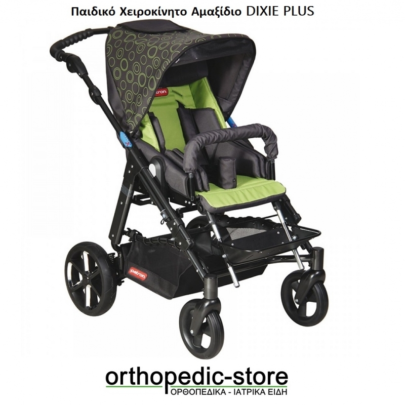 Παιδικό χειροκίνητο χμαξίδιο DIXIE PLUSΕ με ειερχόμενο κάθισμα. Αντίστροφη τοποθέτηση καθίσματος (προς τη μεριά του συνοδού). Πλάτη πλήρως ανακλινόμενη. Ρυθμιζόμενη γωνία και ύψος υποποδίου. Σκελετός με ανάρτηση. Διαχωριστικό σκελών. Στήριγμα κεφαλής. Ζώνη 5 σημείων. Καλάθι υφασμάτινο. Χειρολαβή συνοδού εργονομική και ρυθμιζόμενη στο ύψος. Μπάρα ασφαλείας με μαλακό κάλυμμα, προσθαφαιρούμενη.