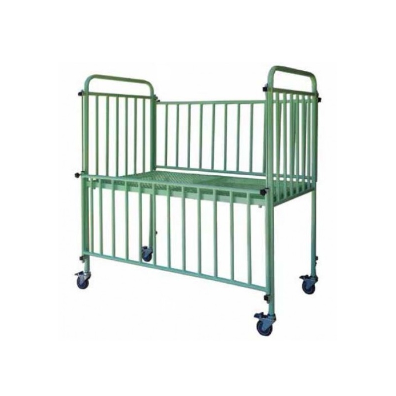 Παιδιατρική κλίνη με συρόμενα πλαϊνά και υποδοχή για στατώ ορού. Στιβαρή και ανθεκτική κατασκευή με ρόδες και φρένα.